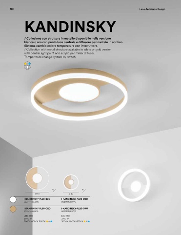 bianca o oro con punto luce centrale e diffusore perimetrale in acrilico. sulla superificie creando una geometria dal gusto deciso. Declinata nelle versioni